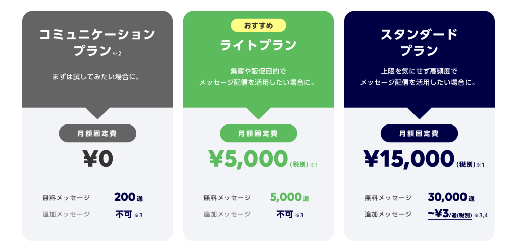 つまり、無料のコミュニケーションプランや、月額5,000円のライトプランを使っている場合、「追加で1,000通だけ買う」という選択肢はありません。上のプランに切り替えるのが唯一の解決策です。