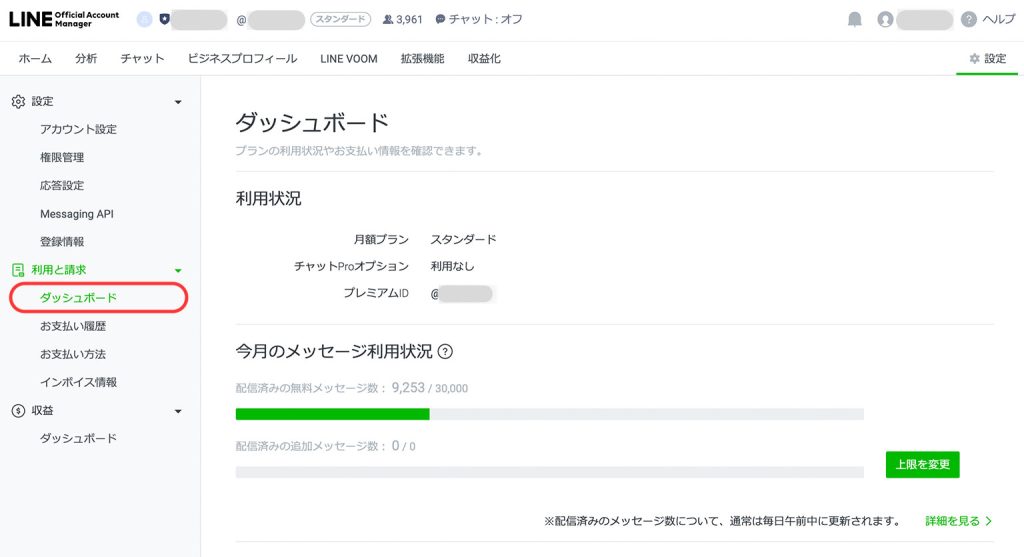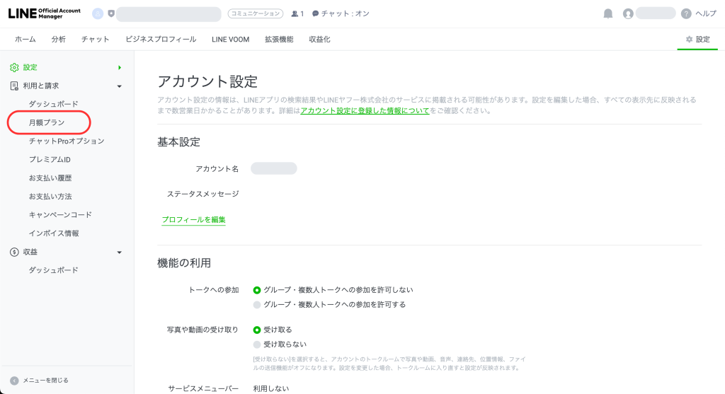 メッセージが送れなくなった時は、まず管理画面の「設定 > 月額プラン」を開きましょう。