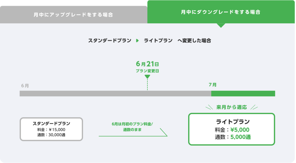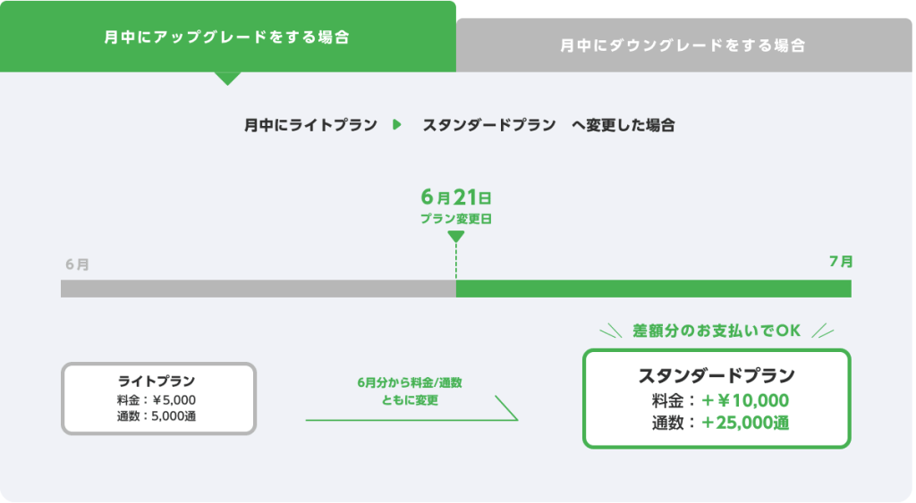 例えば、月の途中でライトからスタンダードにアップグレードした場合、その月の月額料金はライトプランとの差額分(=スタンダードプラン全額)の支払いが発生します。