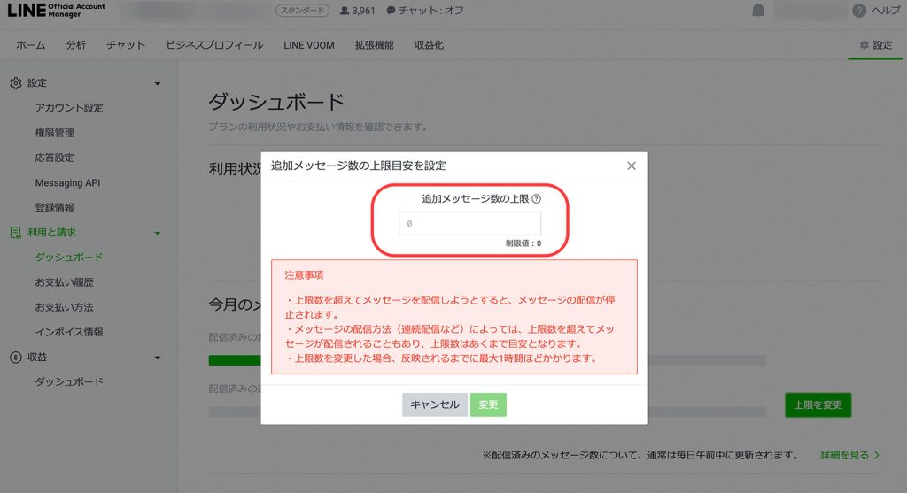 無料配信分を超過してメッセージ配信を行うには、追加メッセージ数の上限目安の設定が必要です。