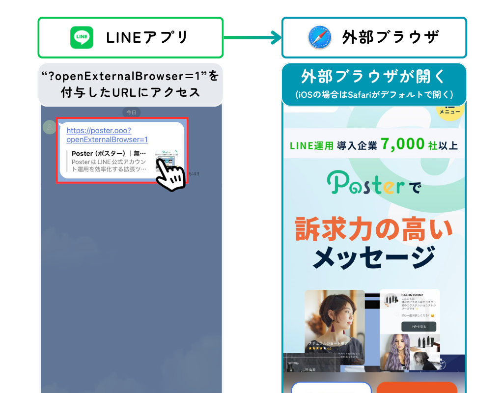 URLに openExternalBrowser=1 を付与するだけで、配信メッセージ内のリンクを外部ブラウザで開くことができます。