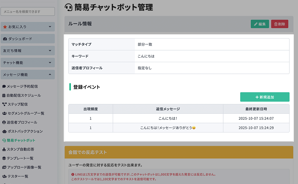 「簡易チャットボット」機能は、友だちから送られてきたテキストメッセージに反応して自動返信させることができます。