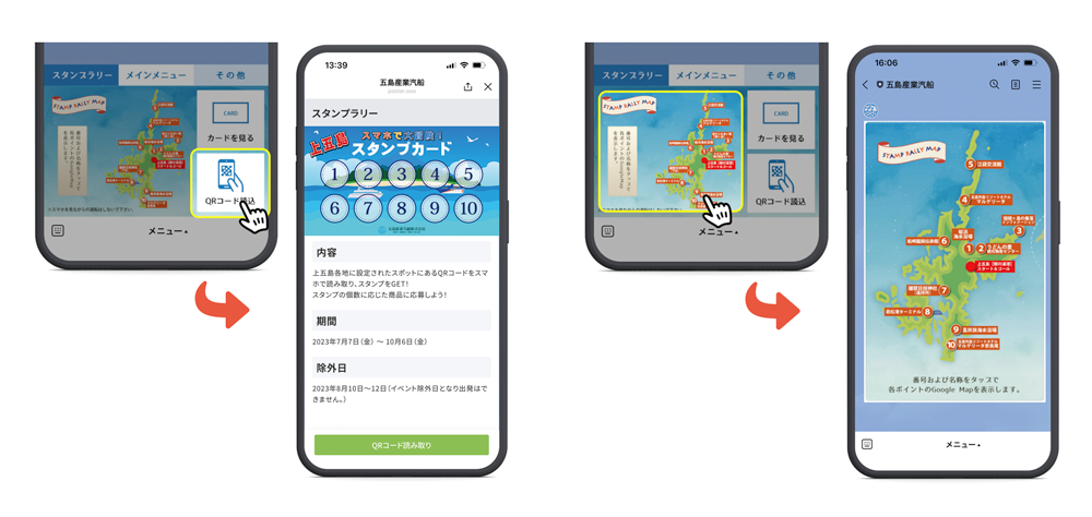 開始QRコードを読み込むとリッチメニューが切り替わり、スタンプラリーがスタート。
