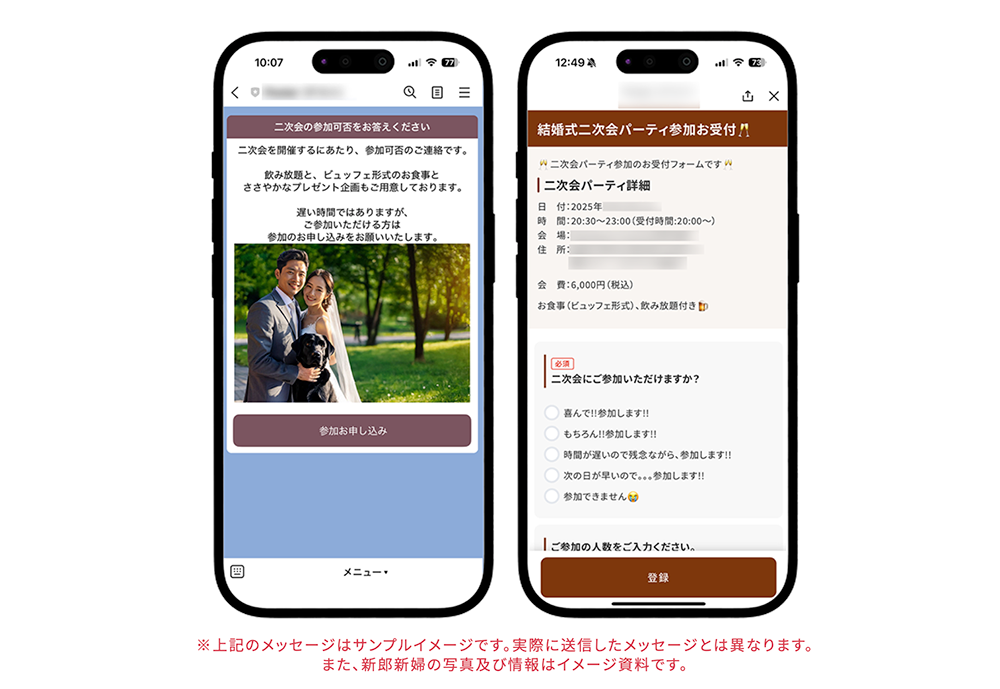 メッセージ配信は全2回配信し、1回目は全ユーザーを対象に、二次会の出欠を確認するアンケートフォーム付きメッセージを配信。