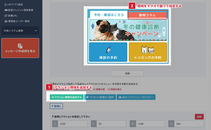 画像をアップロードし、「アクション領域を追加する」ボタンを押します。