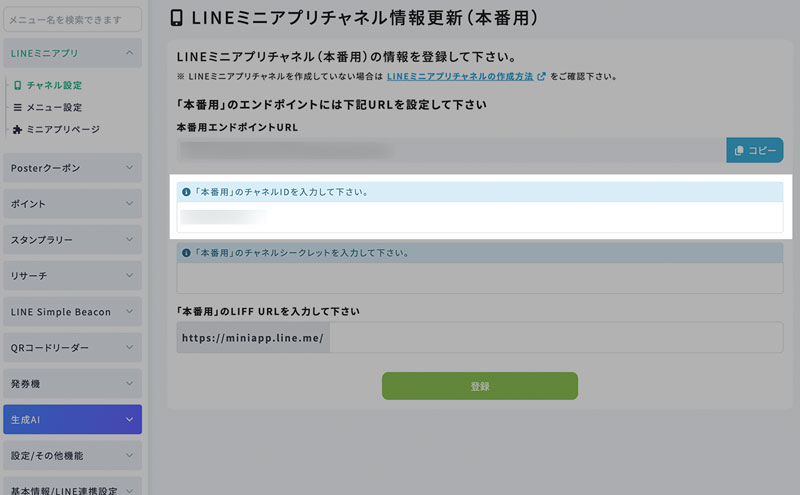 コピーしたチャネルIDは、Poster管理画面の「LINEミニアプリチャネル設定」にて使用します。