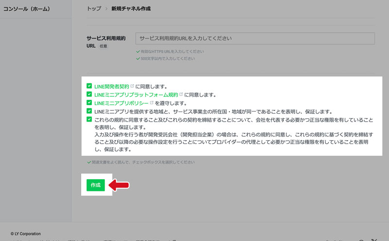 画面下の規約に同意した上で、「作成」ボタンを選択します。