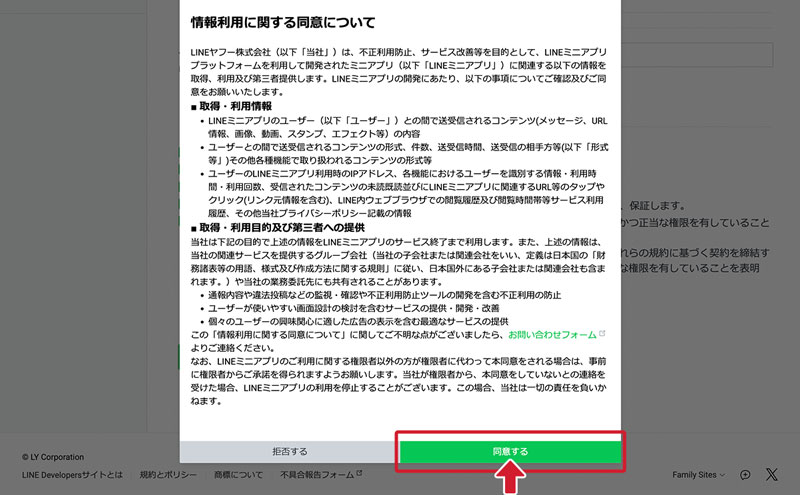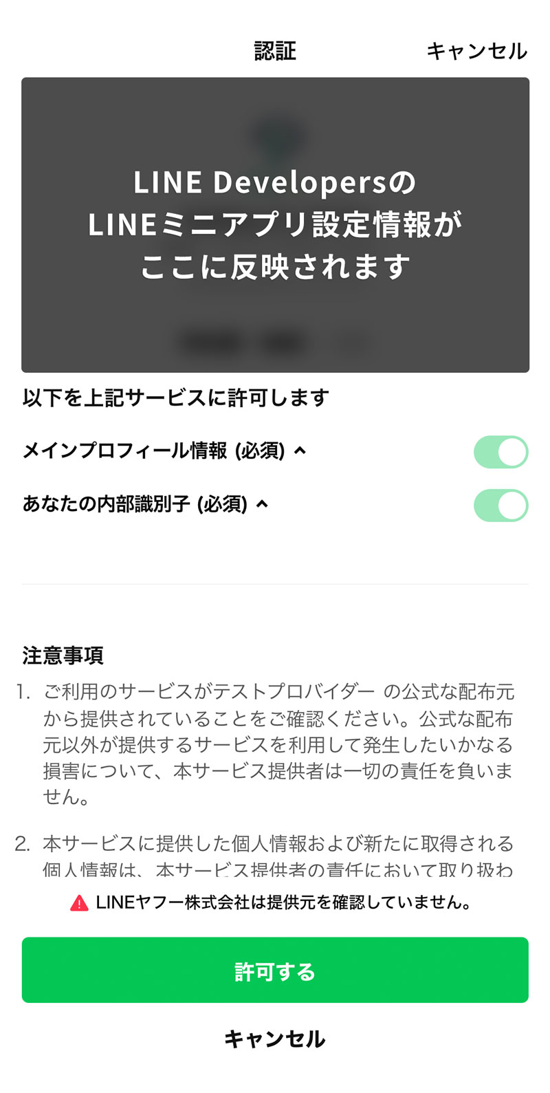 友だちがLINEミニアプリ画面を初めて開いた時に、この許諾画面が表示されます。