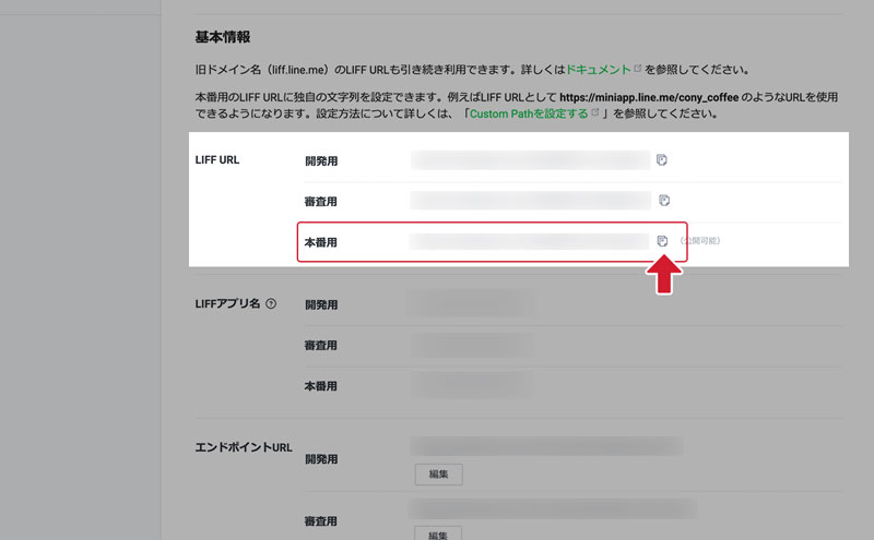 「LIFF URL」の中から、「本番用」のLIFF URLをコピーします。