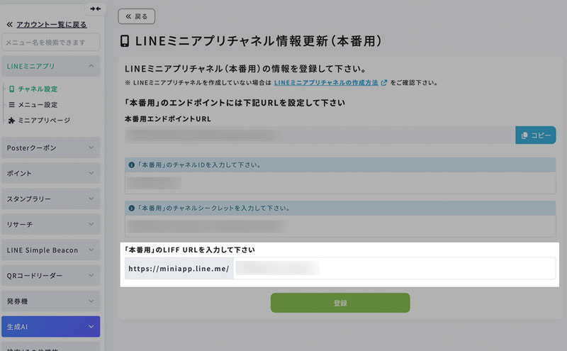 コピーしたLIFF URLは、Poster管理画面の「LINEミニアプリチャネル設定」にて使用します。
