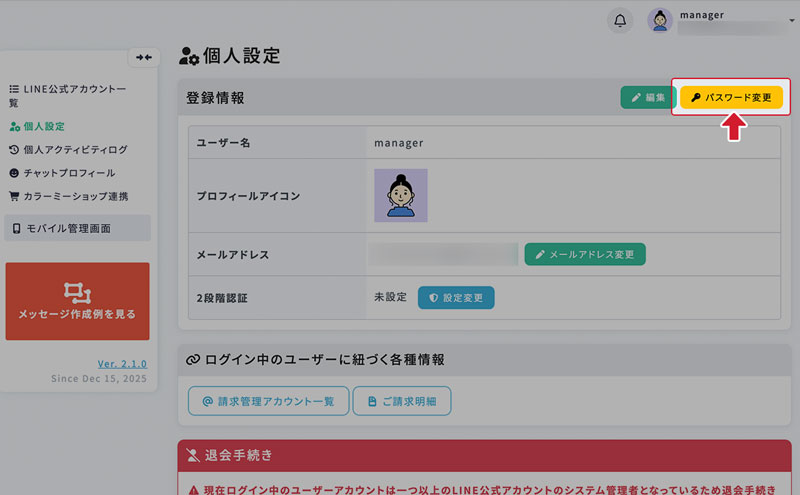 個人設定画面に移動したら、パスワード変更ボタンをクリックします。