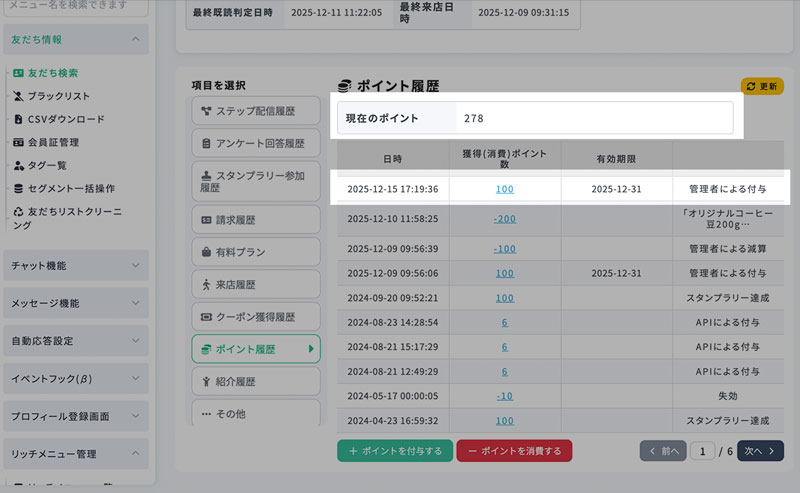 「現在のポイント数」「ポイント履歴」に付与したポイント数が反映されています。