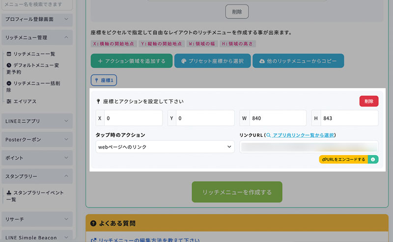 他のアクションエリアの設定も完了したら、リッチメニューを保存します。