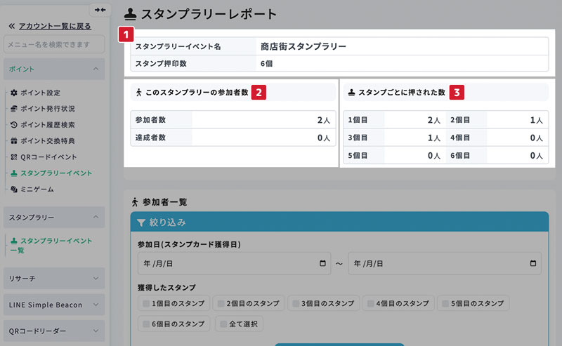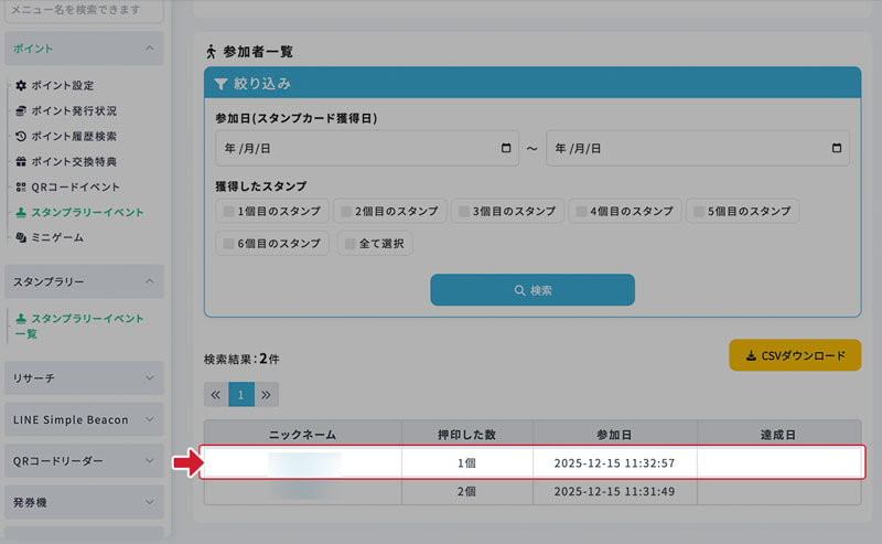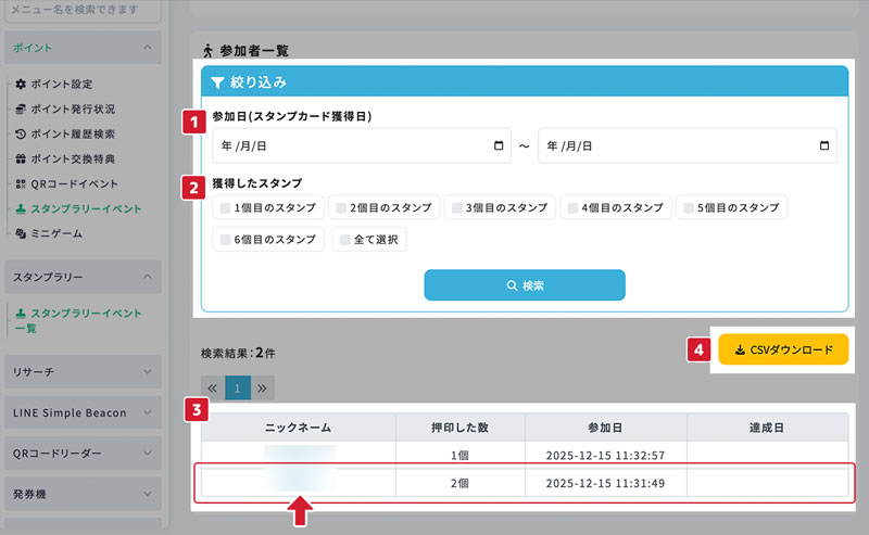 スタンプラリーの参加者から参加日や獲得スタンプ数で絞り込んで検索できます。