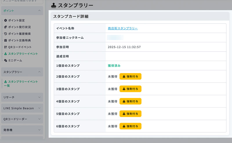 上のメニュー項目からサイドメニューから「スタンプラリー」を開き「 スタンプラリーイベント一覧」画面に移動します。