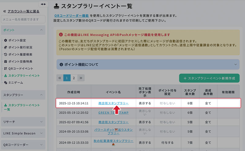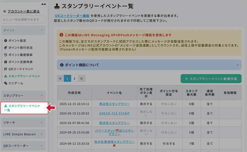 サイドメニューから「スタンプラリー」を開き「 スタンプラリーイベント一覧」を選択します。
