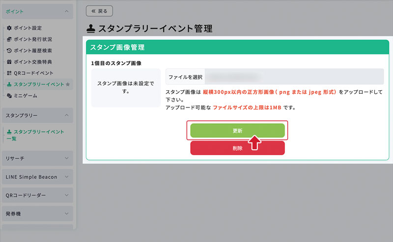 変更したいスタンプ画像をアップロードし、更新を選択して保存します。