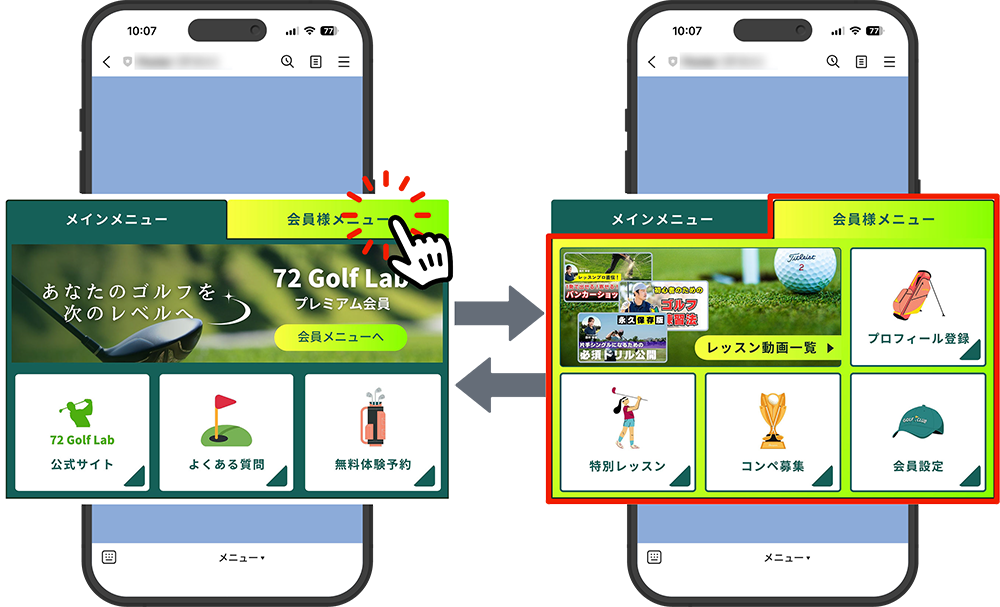 Posterではリッチメニューのレイアウトを自由に設定することができ、2枚以上のリッチメニューをリンクさせ「タブ切り替え風」に作成することもできます。