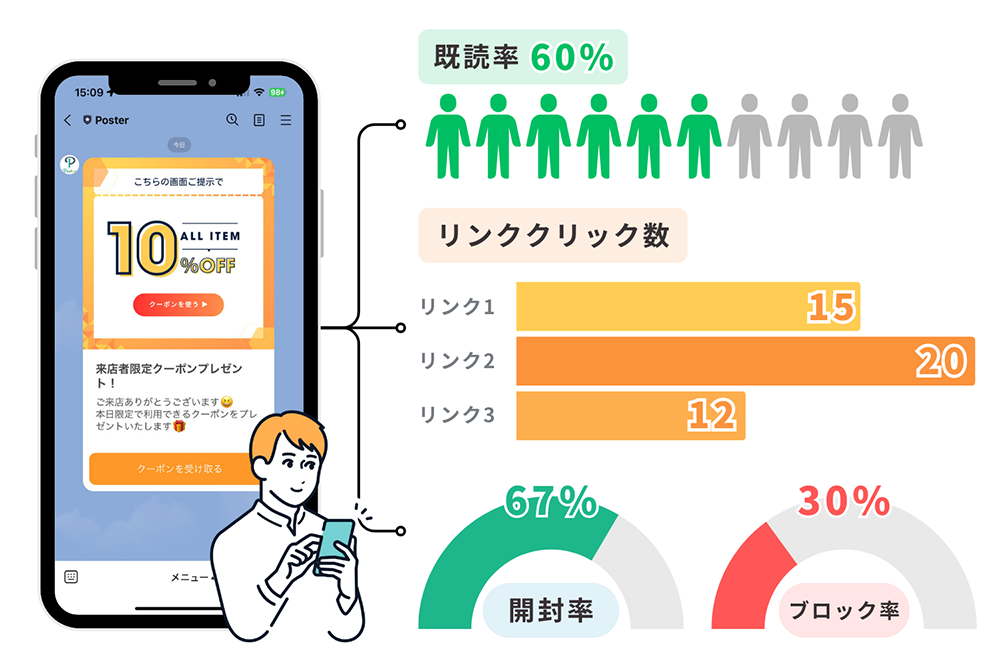メッセージ配信・クーポン使用率など細かく確認可能