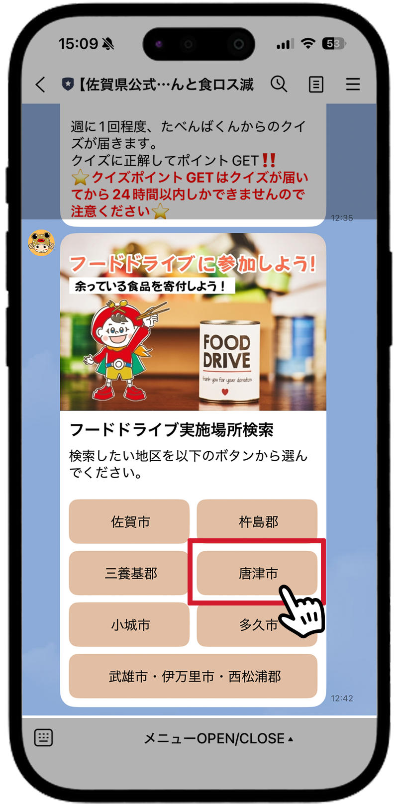 調べたい地区をタップすると、地区のフードドライブ一覧が表示されます。