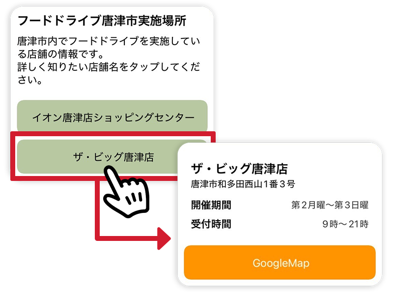 ③「フードドライブ設置場所」をタップするとフードドライブをどこで実施しているのか、検索することができます。