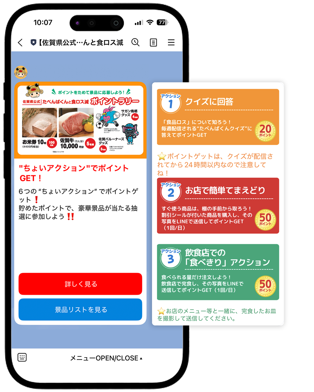 佐賀県の食育キャラクター『たべんばくん』と一緒に、LINEを活用して『食ロスちょいアクション』に気軽に参加してもらい、ポイントラリーなどを楽しみながら食品ロス削減に取り組んでいただけます。